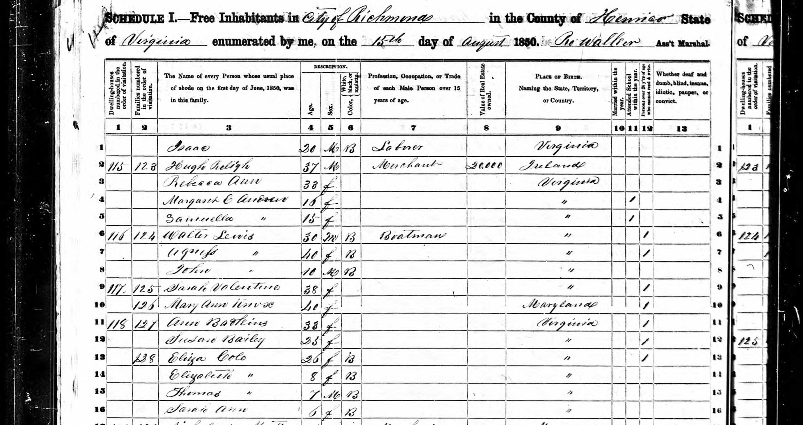 I also searched the 1850 census. I found an Eliza Cole listed as a 26-year-old Black woman living in a Shockoe Bottom neighborhood with three children, Elizabeth (8), Thomas (7), and Sarah Ann (6). Eliza’s profession was not indicated and she was marked as a person who could not read or write. I have not been able to find Eliza in the 1860 census, or any other subsequent records.