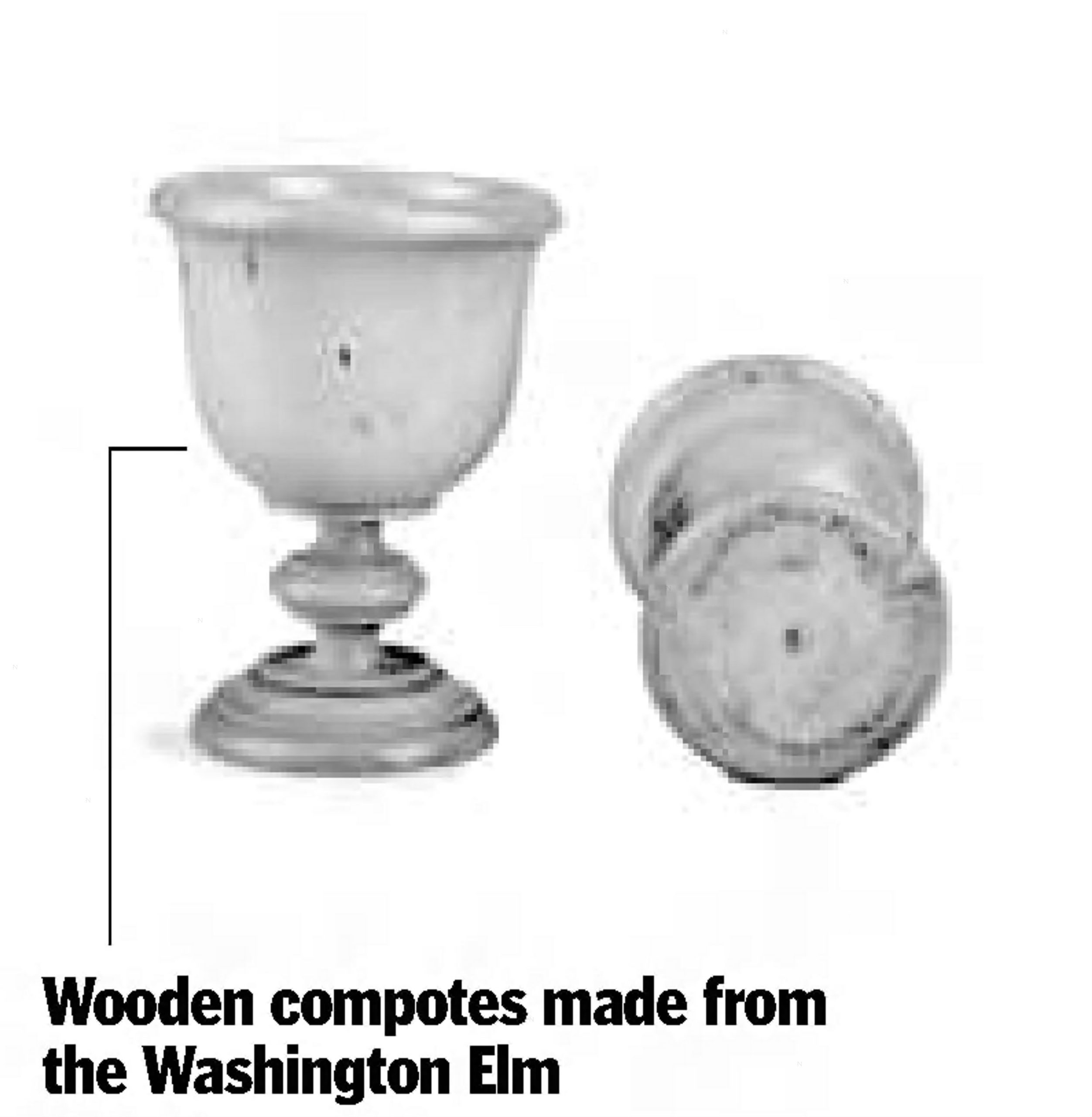 In 1923 the Cambridge Washington Elm was also destroyed, not by eager tourists, but by an infestation of the “elm-bark beetle” which slowly ate it from the inside. It was replaced by a “son” and then a “grandson” grown from cuttings. When the living monument fell, a more permanent stone monument was erected – a monument to a monument – and people scrambled to collect the remaining sticks and branches, fashioning them into cups, a miniature cannon, a book, a thimble, and picture frames.