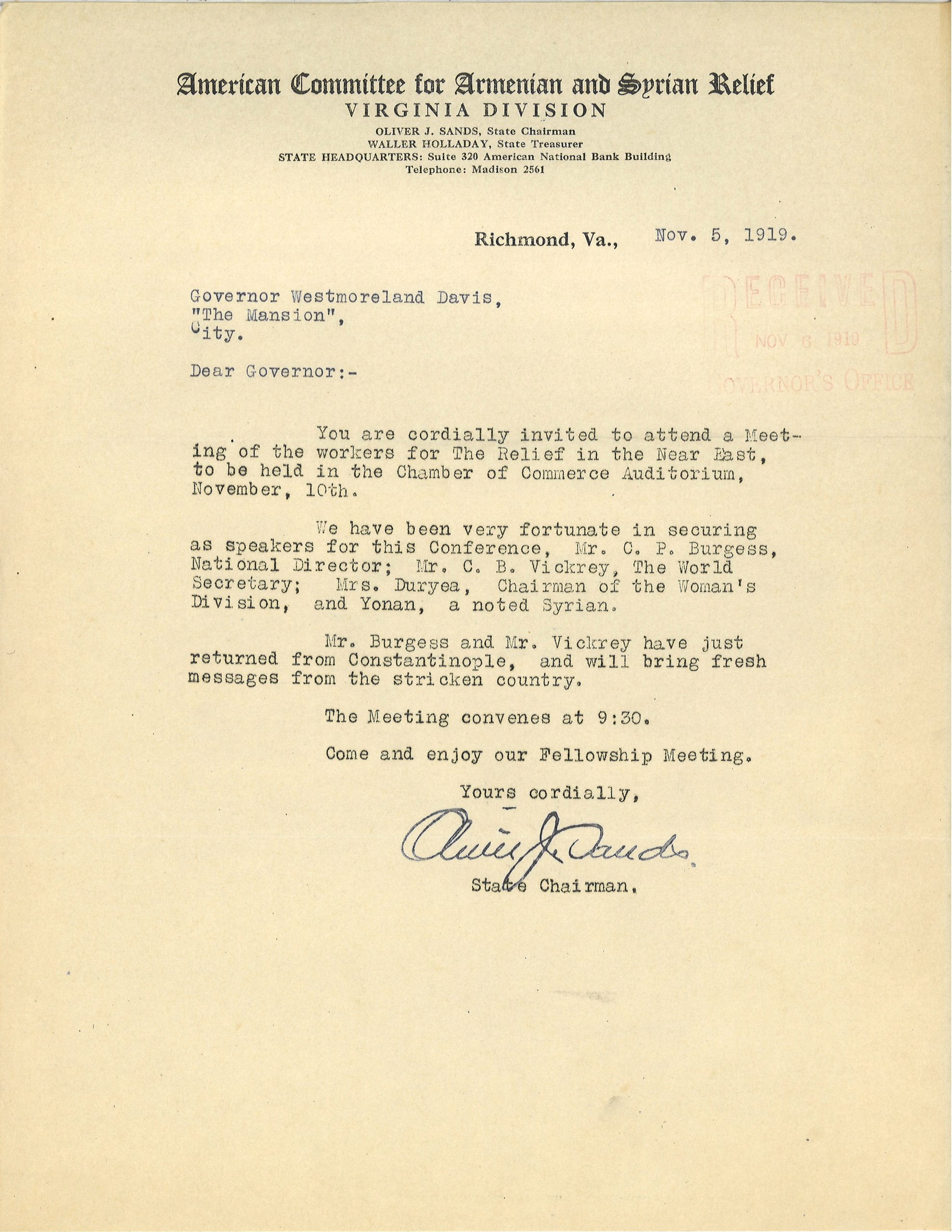 [8] Oliver J. Sands, State Chairman, American Committee for Armenian and Syrian Relief, Virginia Division, Suite 320, American National Bank Building, Richmond, VA, to Governor Westmoreland Davis, The Mansion, Richmond, VA, 5 November 1919, Executive Papers of Governor Westmoreland Davis, 1911-1922, Accession 21567a, Box 4, Folder 5: Armenia, 1919, Library of Virginia, Richmond, VA; “Armenia Suffers while World Observes Peace,” Richmond Times-Dispatch, 11 November 1919, 12.