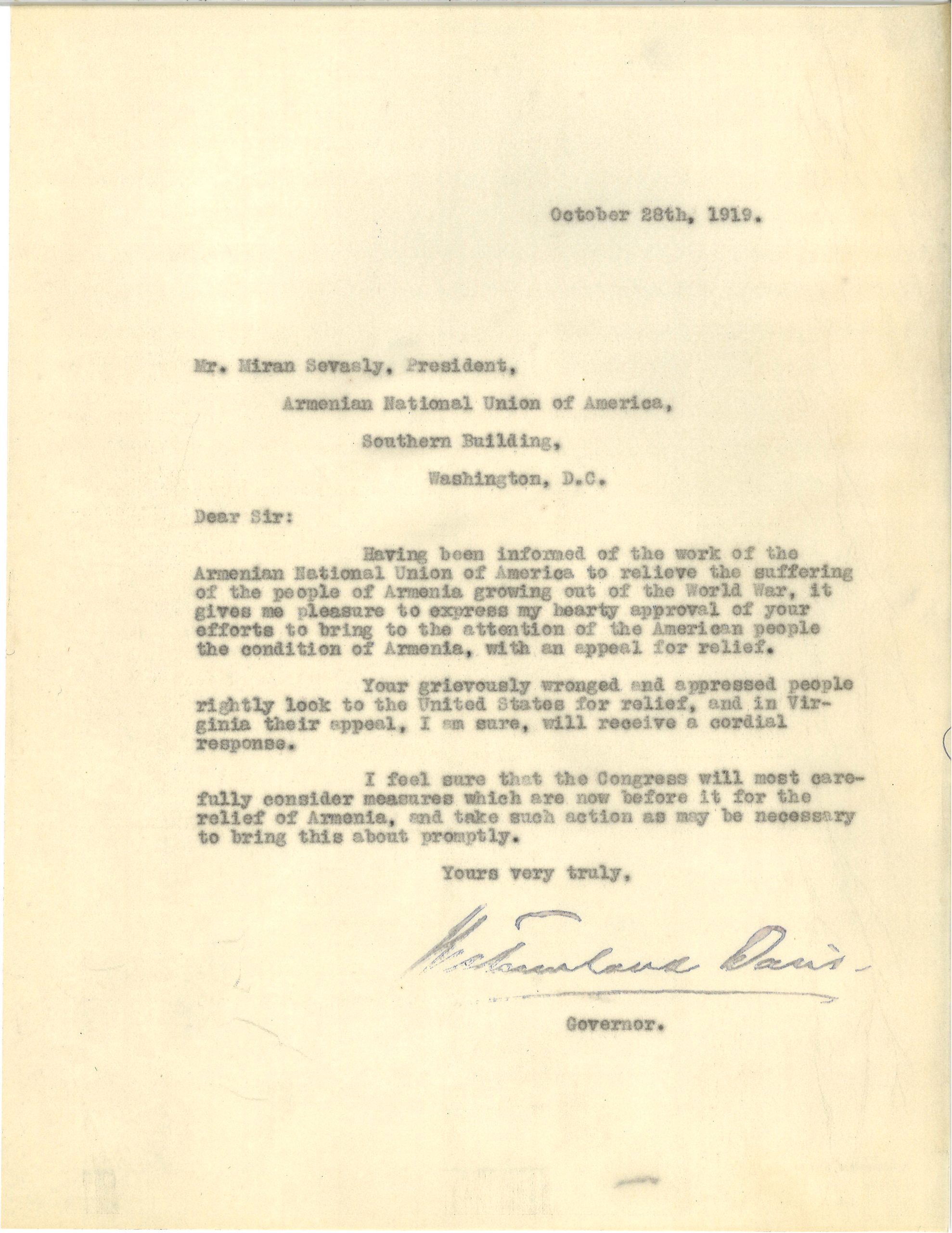 On October 28, 1919, Governor Davis wrote to the president of the Armenian National Union of America (ANUA), Miran Sevasly, to express support for the organization’s relief efforts and confidence that Virginians and Congress would consider assisting with the relief effort. The ANUA was created in 1917 by the Armenian Apostolic Church, the Armenian Evangelic Church, the Armenian Social Democratic Hunchakist Party, the Armenian Revolutionary Federation, the Reformed Armenian Hunchakist Party, the Armenian Constitutional Democratic Party, and the Armenian Benevolent Union. The organization’s goals were “1. Relief work for those destitute in Armenia and for the restoration of ruined and devasted provinces, 2. Armenian propaganda and diplomatic representations to the allied powers with the ultimate aim in view, namely: 3. Armenian self-government.” They were allied with the ACASR in that they forwarded donations to them. The ANUA’s activities through April 1919 were chronicled in The Armenian Herald.10