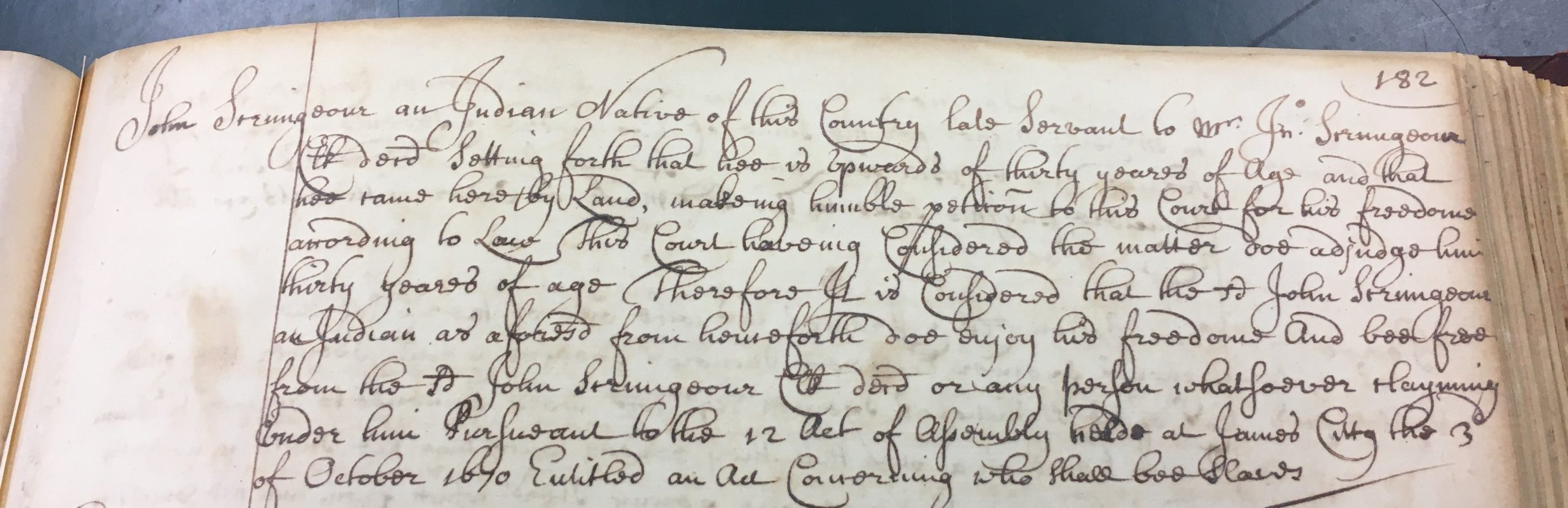 “John Scrimgeour an Indian Native of this Country late Servant to Mr. Jn. Scrimgeour [deceased] Setting forth that hee is upwards of thirty years of Age and that hee came here by Land, making humble petition to this Court for his freedom according to Law. This Court having Considered the matter doo adjudge him thirty years of age. Therefore It is Confidered that the sd John Scrimgeour r an Indian as aforesaid from henceforth doo enjoy his freedom and bee free from the sd John Scrimgeour [deceased] or any person whatsoever clayming under him Pursuant to the 12 Act of Assembly held at James City the 3d of October 1670 Entitled an Act Concerning who shall bee slaves.”