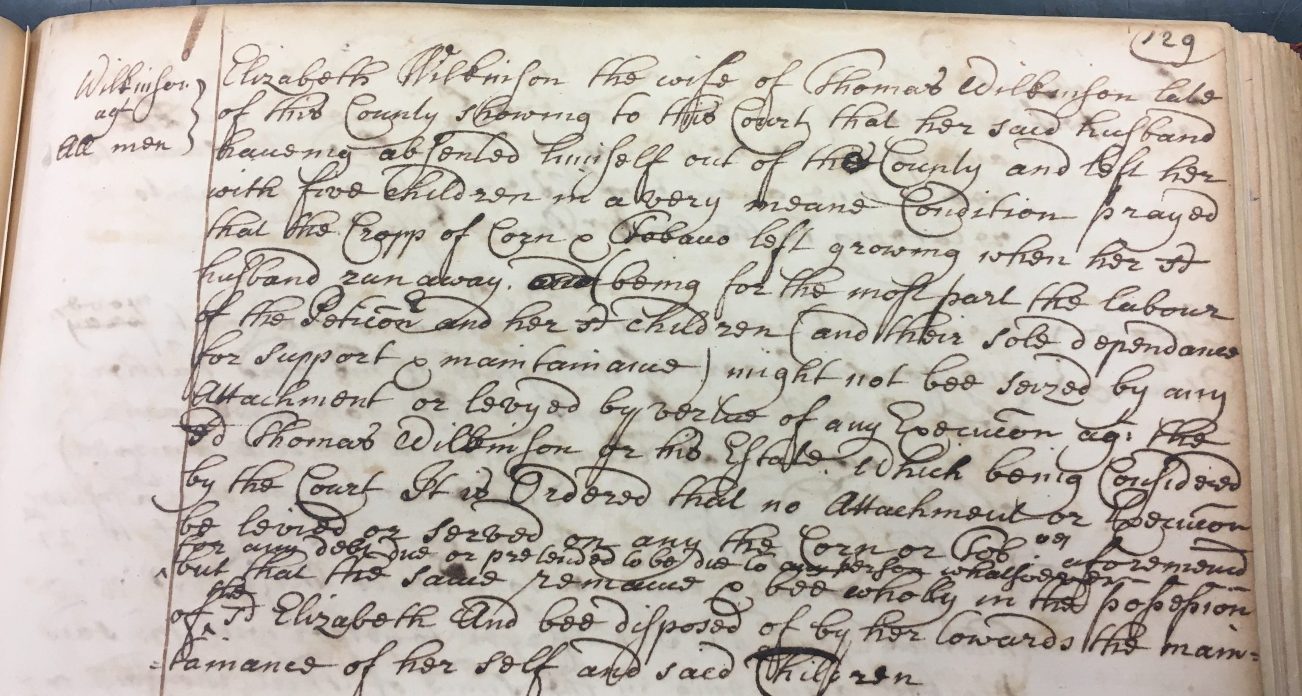 “Elizabeth Wilkinson the wife of Thomas Wilkinson late of this County showing to this Court that her said husband having absented himself out of the County and left her with five children in a very meane condition prayed that the Crops of Corn & Tobacco left growing when her sd hussband ran away (being for the most part the labor of the Petitioner and her sd children (and their sole dependence for support & maintainance) might not bee served by any attachment or levyed by virtue of any Execution ag’t the sd. Thomas Wilkinson or his Estate. Which being Considered by the Court It is Ordered that no Attachment or Execution be levied or served on any of the Corn or Tob’o aforementioned but that the land remains & bee wholly in the possession of the sd Elizabeth And bee disposed of by her towards the maintenance of her self and said Children.”