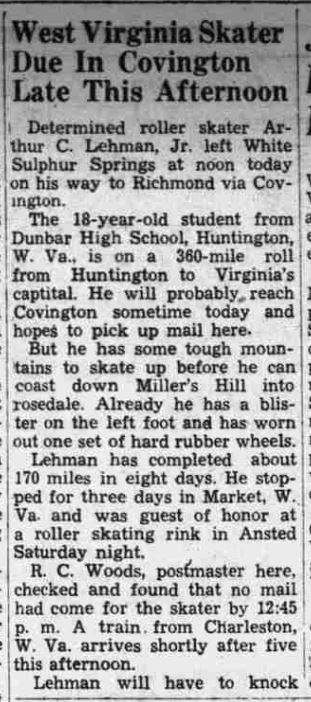 And so, Lehman successfully skated across West Virginia and Virginia and then the adventure was done. Through heavy rains, over punishing roads, with blistered feet and very little money (a total of about $30, $11 or $12 of which was donations), Lehman had successfully skated his way from Huntington, West Virginia to Richmond, Virginia with what might be described as an anticlimactic conclusion.