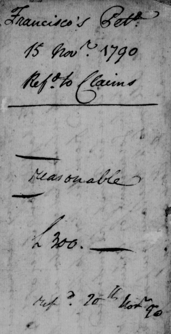 Interestingly, a memorandum written on the outside of Francisco’s petition notes that it was found “reasonable” and then simply includes the sum “£300,” along with “ref’d 20th Nov 90.” But it is not clear if that’s a finding or recommendation from the Committee or from the Auditor of Public Accounts or from somebody else.